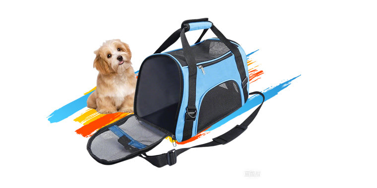 This pet travel bag features a combination of blue and black colors. It can be carried by hand or over the shoulder. The bag is well - ventilated, has a large front opening, and a small side pocket, which is very practical.